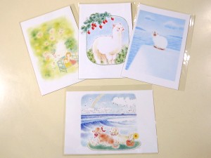 ちゃちゃワールドのある生田原出身のaikoさんが描く女の子や動物をモチーフにしたふんわり優しいイラストのポストカードです。 1枚150円(税込) |