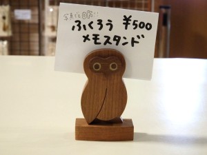 木工房ゼペット指導員オリジナル、手のひらサイズのふくろうがモチーフのメモスタンドです。写真も挟めます! 500円(税込) |
