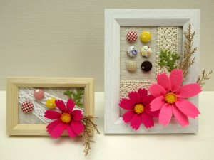 ピンクのコスモスがお部屋を華やかに彩ります。フェルトで作られたフレーム飾りです。製作者のフェルト作家井上さんの展示は近日中にスタート! 大990円 小660円(税込) |