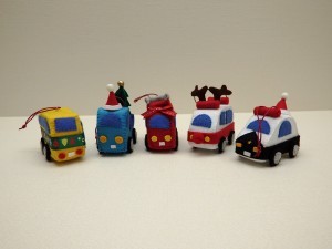 バスや消防車、パトカーなどのはたらく車にクリスマスらしい飾りがあしらわれたオーナメントで、すべてフェルトで作られています。 ひとつ660円(税込) |