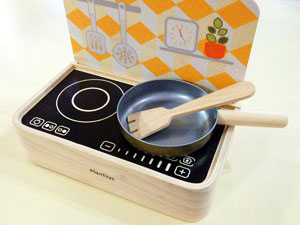フライパンと調理用のヘラが付いています。キッチンの中におままごと道具を入れてどこへでも持ち運べるデザインが特徴です。 4,950円(税込) |
